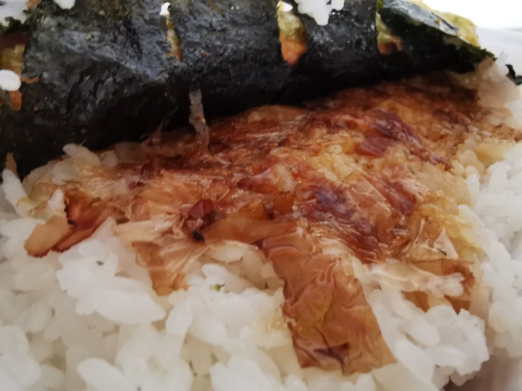 はみ出しそうな程に敷き詰められたのりの下には花かつお、これが口の中に入れる瞬間に醤油との香りで満たされるんですね。