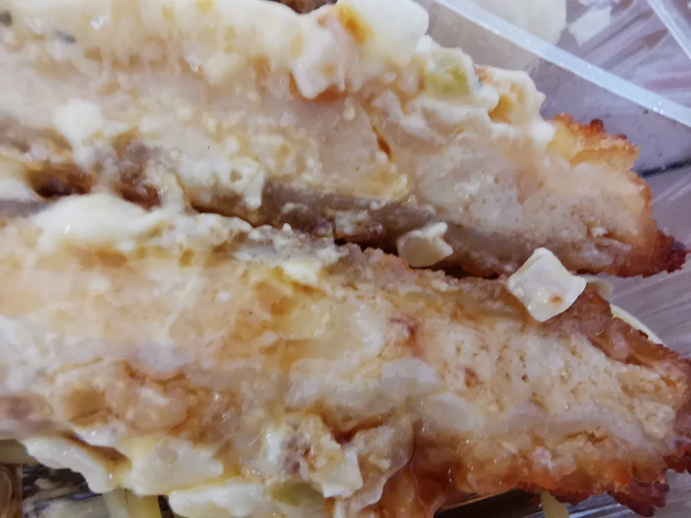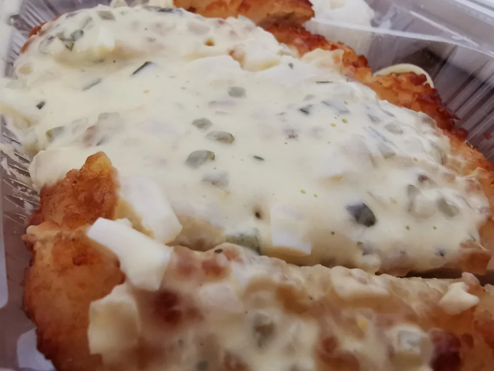 - 見た目通りに、ゆで卵とタマネギに包まれたピクルスの食感が楽しめるタルタルソースでした。ふんわり系のチキンと美味しく頂いていると、うっかり甘酢ソースをかけ忘れてしまいそうでした。甘酢ソースがサラサラ系だったので、少しでも浸み込み易くしてやろうと思い、チキンの断面に降り注いで食べてやりました。