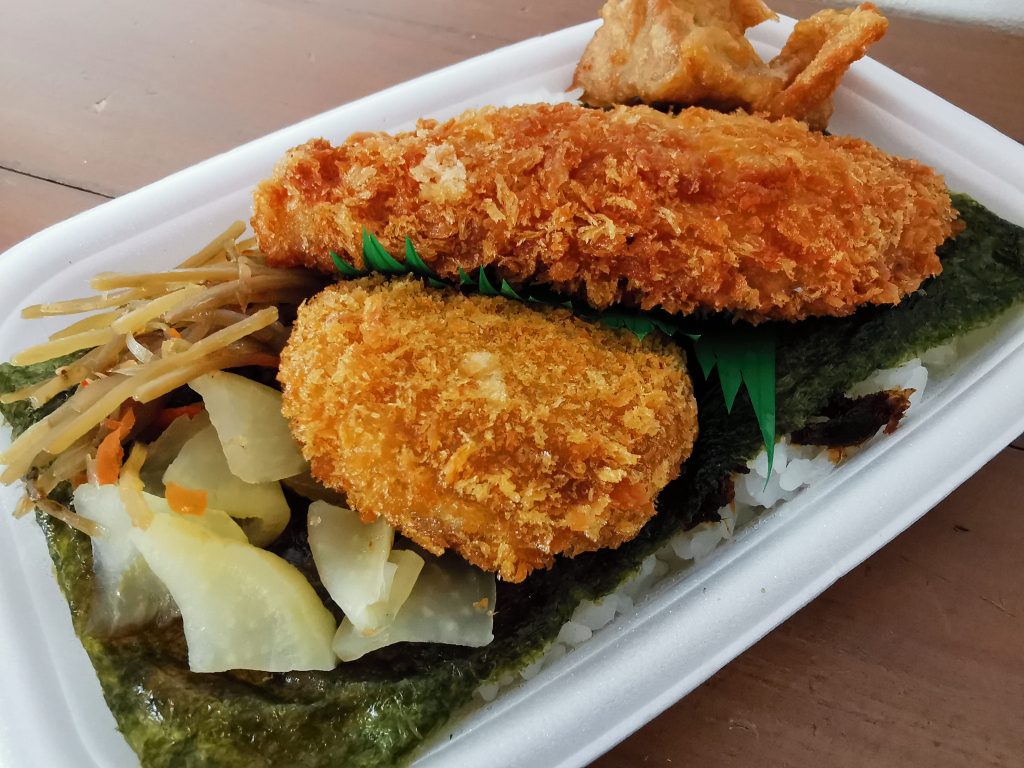 「から揚」「白身フライ」「メンチカツ」「きんぴら」「たくあん」が乗せられております。