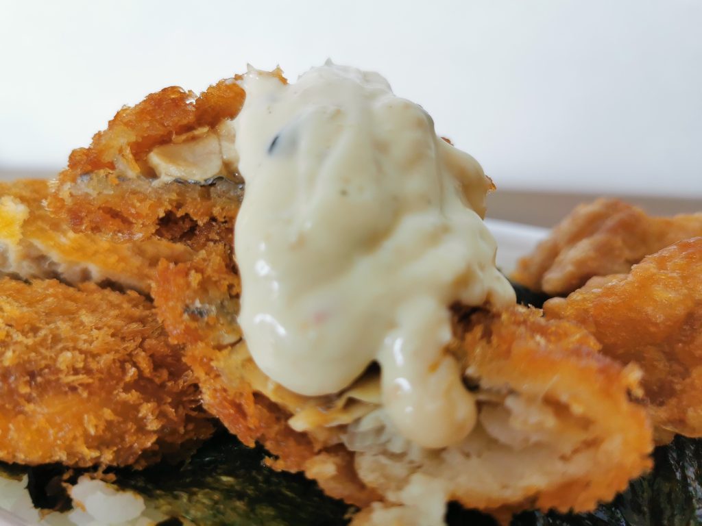サックリとした白身フライの上へ、タルタルソースですよ。