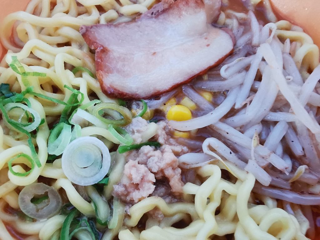 もやし・チャーシュー・そぼろ・ねぎ・コーンと華やかな見た目の下には、更に彩りを加える色味のちぢれ麺。